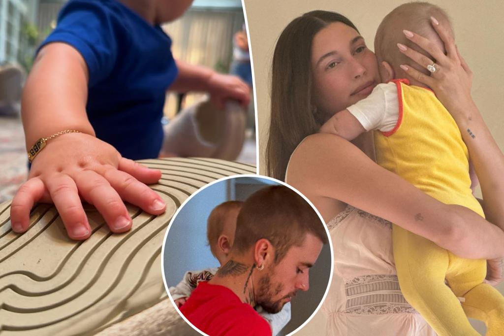 In her post, Hailey showed her son gripping the wall of his playpen, wearing the gold chain bracelet.