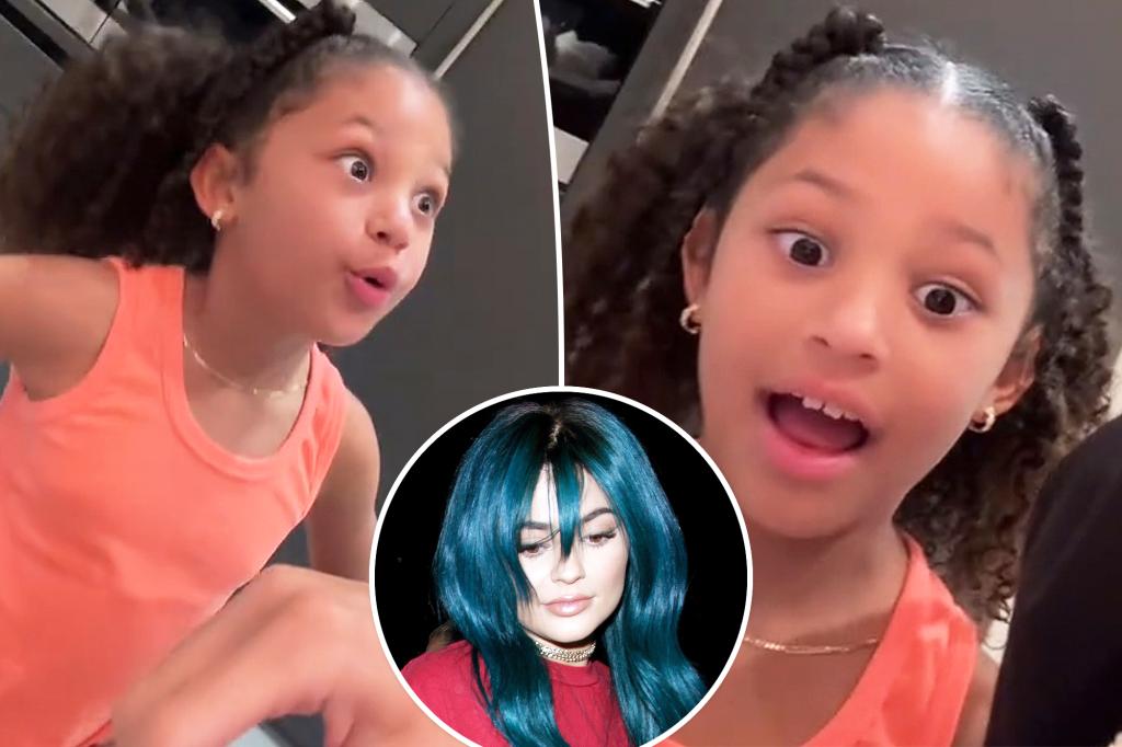 The Kardashians star posted on TikTok a clip showing her 7-year-old’s playful reaction to an old photo of Kylie in a blue wig.