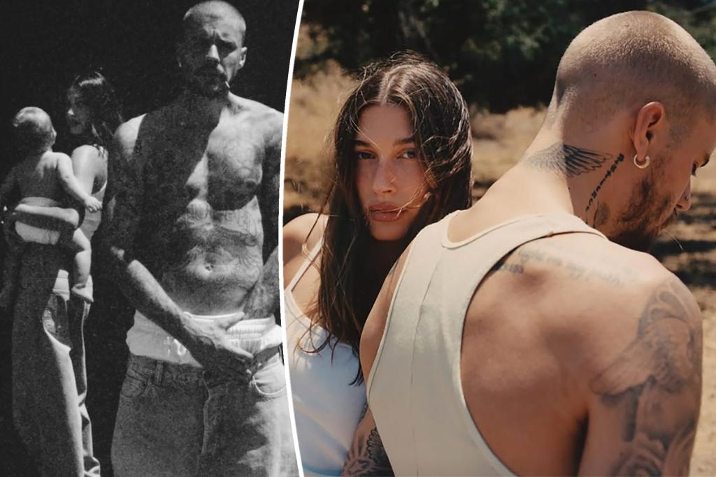 Another photo features the couple, married since 2018, dressed casually in light-wash jeans, holding their 10-month-old son, Jack Blues. Hailey models her white tank with her son, while Justin’s white boxers peek out from his jeans. They also sport matching slides from Justin’s Skylrk brand, highlighting their coordinated style, a rarity given their usual mismatched fashion choices.