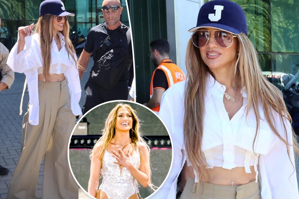 Jennifer Lopez was recently seen donning a revealing white crop top, revealing her toned abs, in Malaga, Spain, before her evening performance. The long-sleeved top featured a stylish back cut-out and several buttons left undone, showcasing layered gold necklaces, including a body chain and a nameplate pendant. She paired the top with beige wide-legged pants, accessorized with a navy baseball cap, a black crocodile leather bag, and aviator sunglasses, creating a chic and relaxed look.