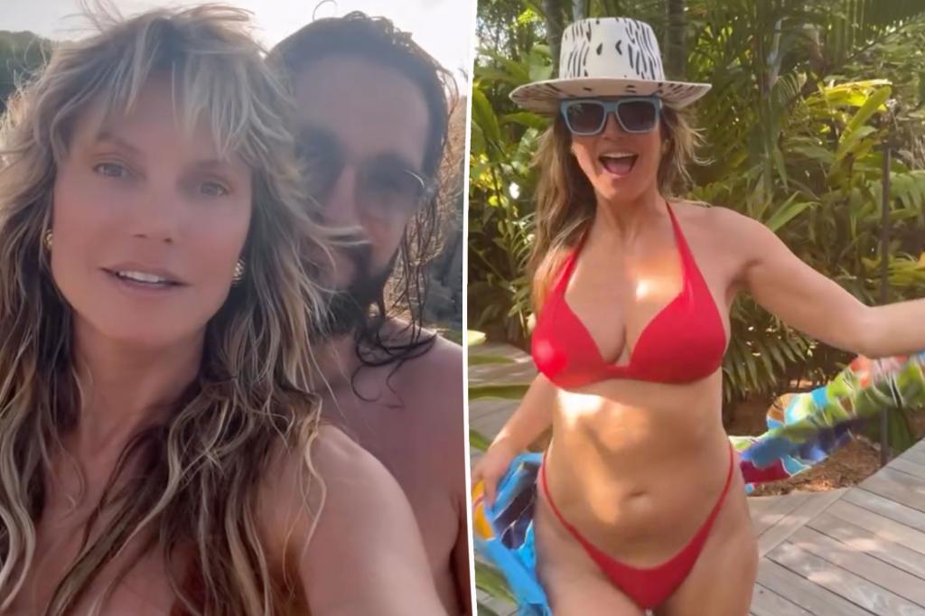 Later, the couple was seen vibing together while listening to music. Klum, dressed in a copper-colored bikini with a towel wrapped around her waist, captioned the moment, “🥳❤️ Sunday fun-day,” and playfully untied her colorful cover-up to reveal a vibrant red bikini underneath as she strolled through a tropical setting.