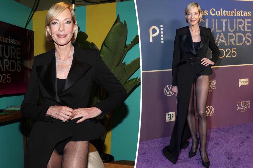 Actress Allison Janney made a striking appearance at the Las Culturistas Culture Awards, held at The Orpheum Theatre in Los Angeles. Wearing a sleek black bodysuit beneath a dramatic double-breasted jacket with a sweeping train, she showcased her long, toned legs in a stylish, pantsless look.