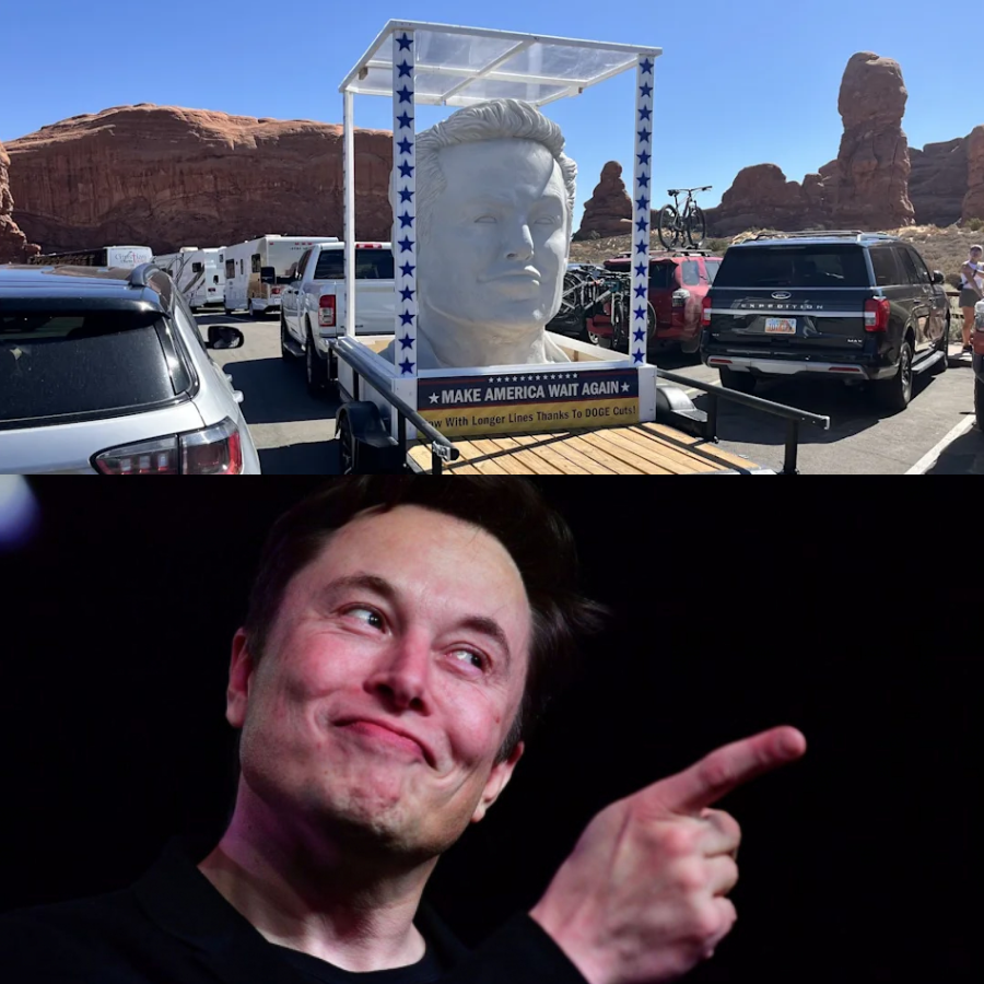 A tall sculpture resembling Elon Musk was briefly displayed at Arches National Park in Utah over the weekend. The statue, estimated to stand between 10 and 12 feet tall, was mounted on a trailer pulled by a white pickup truck. It featured a self-satisfied smirk and was surrounded by a frame decorated with blue stars, along with a sign styled after a presidential signature that read: “MAKE AMERICA WAIT AGAIN, Now With Longer Lines Thanks To DOGE Cuts!”