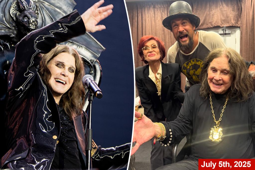 He donned a black sequin shirt, complemented by a striking black jacket with a gold band labeled “Ozzy” and leather pants. The event was a 10-hour celebration featuring performances by Metallica, Guns N’ Roses, Jack Black, and more, all hosted by actor Jason Momoa.