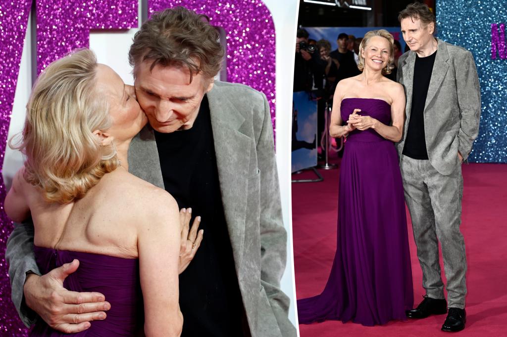 During the London premiere of “The Naked Gun,” Pamela Anderson exchanged a friendly gesture with her co-star Liam Neeson. Anderson leaned in to give Neeson a kiss on the cheek as they posed together on the red carpet, highlighting their close rapport.