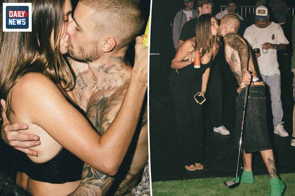 The intimate photo shows a shirtless Justin showcasing his tattoos as he kisses Hailey, who has her arms around him while holding a drink. Hailey, 28, is also a mother to their 10-month-old son, Jack Blues.
