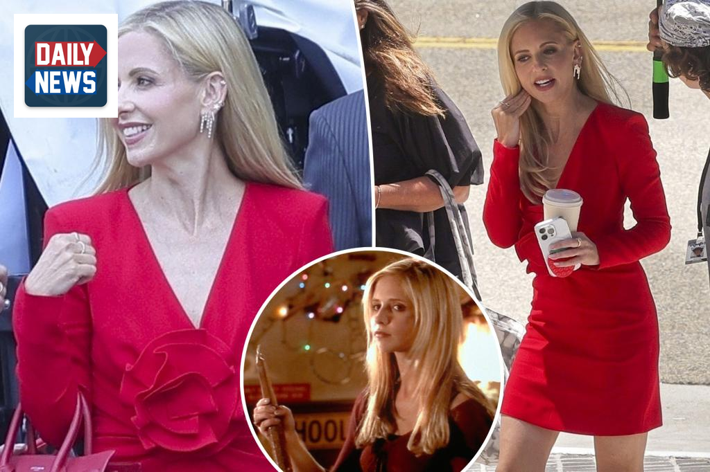 Sarah Michelle Gellar was spotted on the set of the highly anticipated “Buffy the Vampire Slayer” revival, looking stunning in a bold red mini dress adorned with a large rose detail at the waist. She completed her look with matching bright red stilettos and a stylish Yves Saint Laurent handbag, effortlessly slipping back into her role as Buffy Summers.
