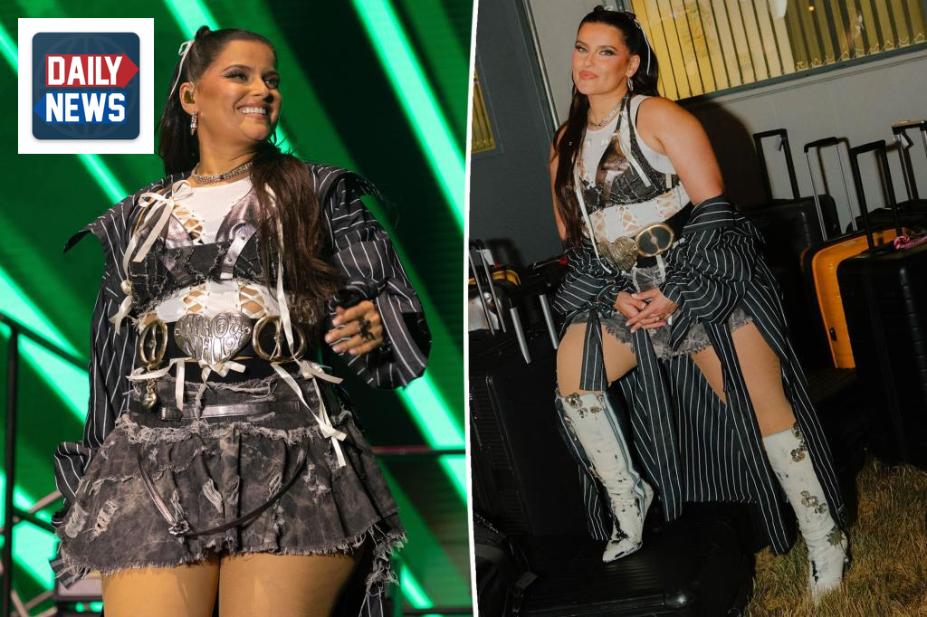 The singer known for hits like “Say It Right” made a remarkable appearance at a major festival in the UK on Friday night, showcasing a striking ensemble. She stepped onto the stage wearing a chic white cutout top layered beneath a distressed denim crop top, creating a bold yet stylish look.