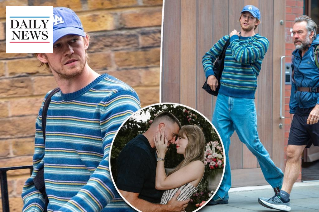 Joe Alwyn was seen in London, dressed entirely in blue, his first appearance since Taylor Swift announced her engagement to Travis Kelce. He wore a striped blue sweater, jeans, a