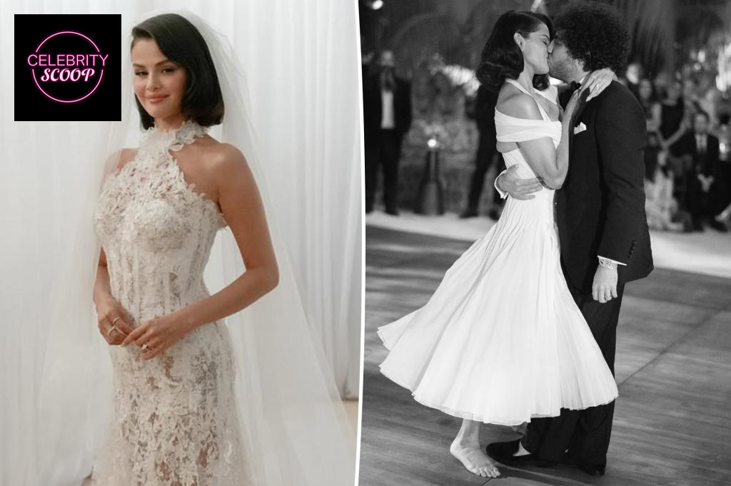 In the photos, Gomez wore a vintage-inspired Ralph Lauren off-the-shoulder dress with a 50s flair, complemented by a simple lily of the valley bouquet and classic old Hollywood curls. Blanco, dressed in a tuxedo vest and partially unbuttoned shirt, appeared joyful as he led the bride back down the aisle. The newlyweds celebrated with a toast and tender moments, including Gomez lounging on a couch wrapped in Blanco’s arms and both sharing a kiss.