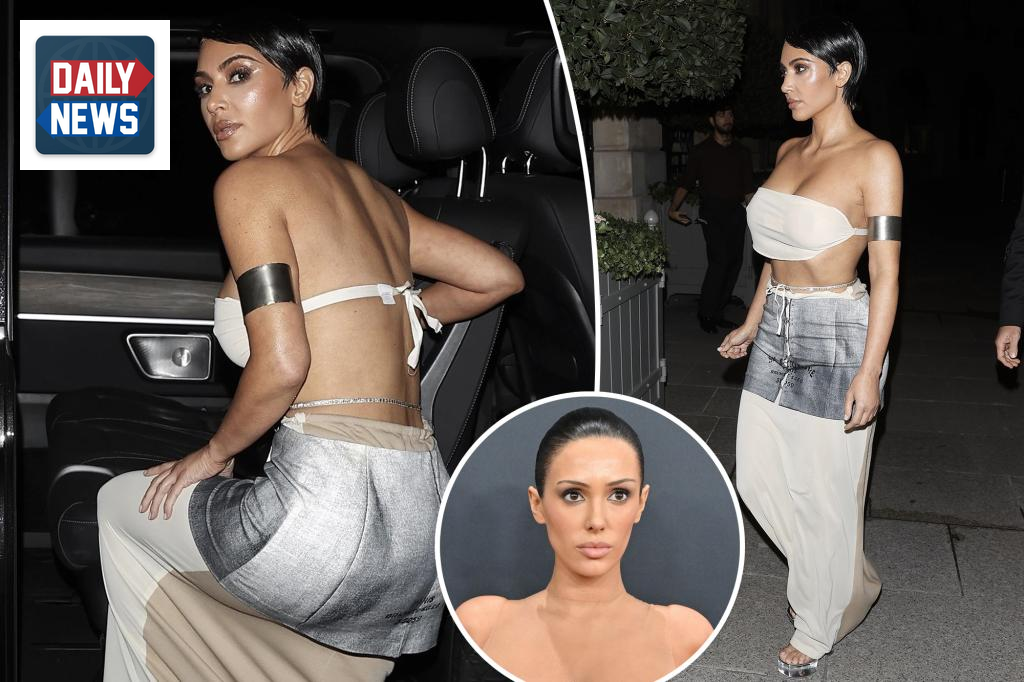 Kim Kardashian made a striking fashion statement as she exited the Ritz Hotel in Paris wearing a daring vintage outfit. She donned a fitted, sheer bandeau top paired with a trompe l’oeil skirt from Maison Martin Margiela’s Spring/Summer 1999 collection, turning heads with her bold look.
