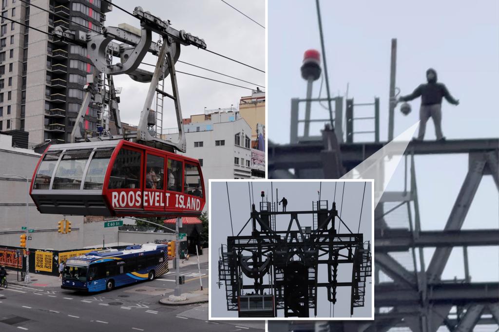 On Monday evening, a daring individual wearing a hoodie and mask climbed the Roosevelt Island Tramway tower, prompting police rescue efforts, including the use of climbing gear, as seen in