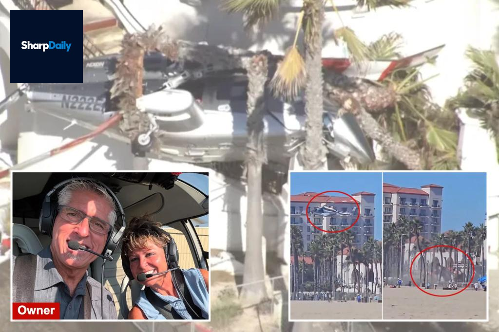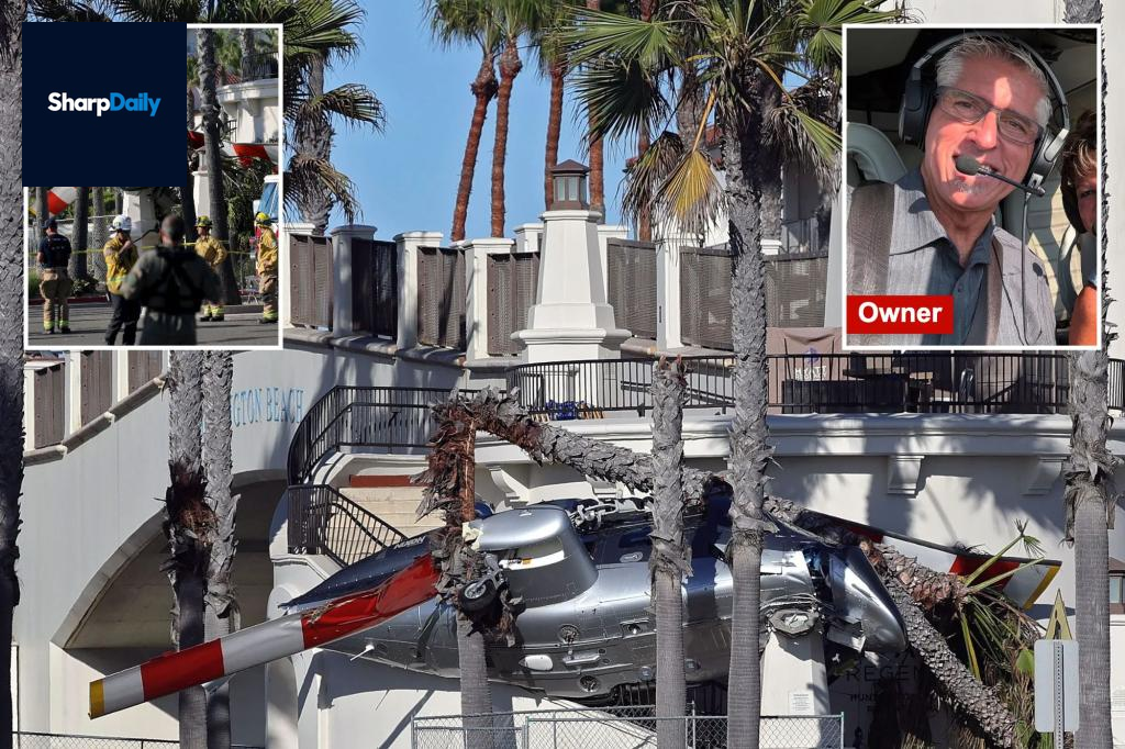 Helicopter Crash at California Beach Injures Five A helicopter, known for performing daring stunts, lost control and crashed into a row of palm trees near Huntington Beach, resulting in multiple